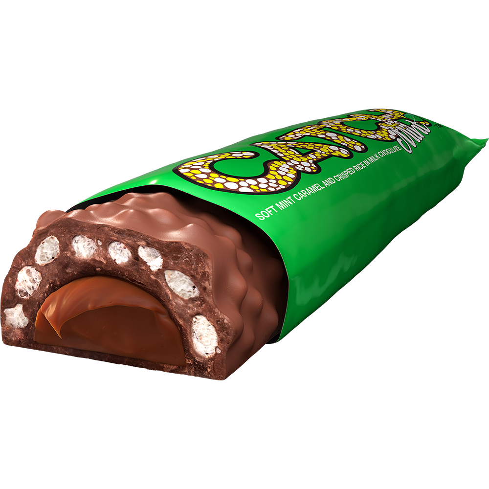 Mint flavored chocolate, caramel, crisped rice bar.
